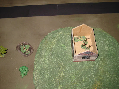 Turn 4: The leading fire team again engages Sir Prufrock in an ineffective fire fight, Infantry exit the the gully as does the Halftrack but promptly has it's Gunner killed and decides discretion is the better part of